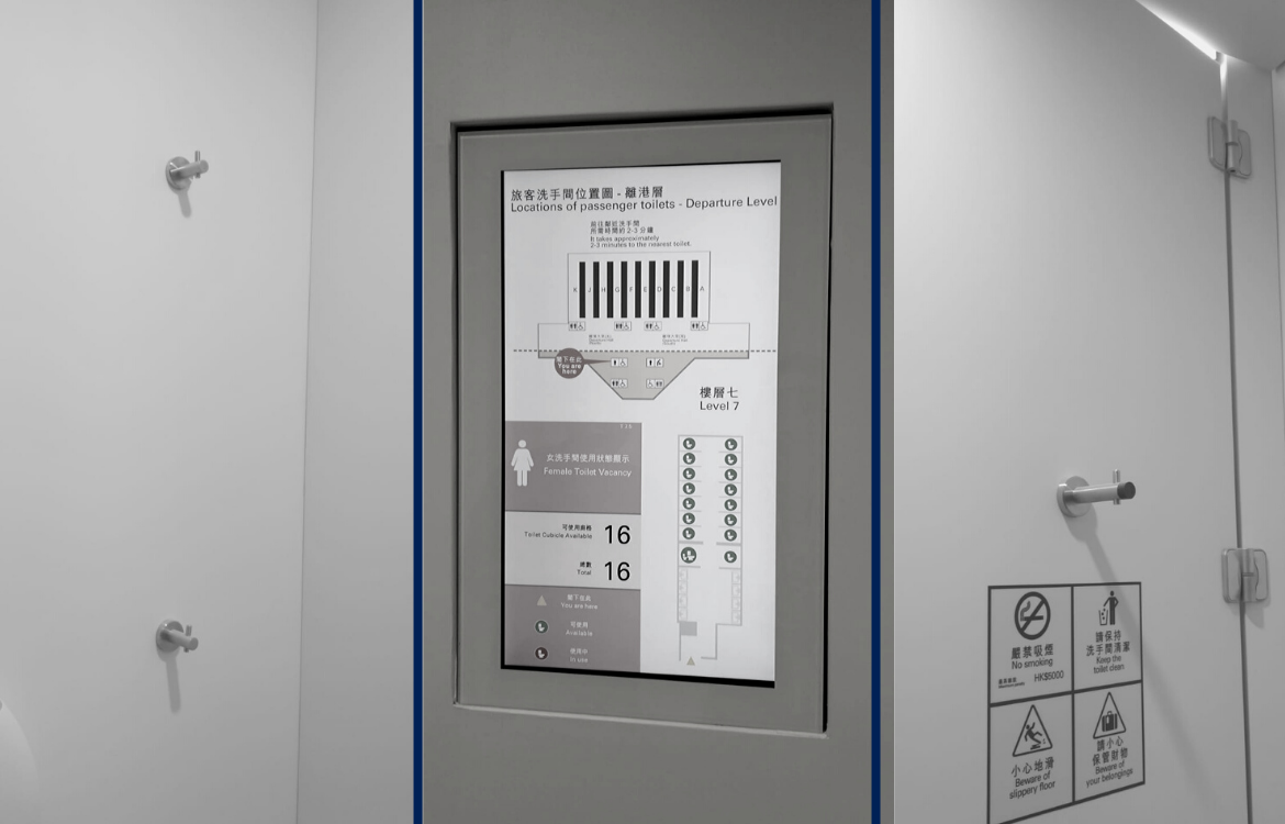 Through Metlam Australia Hong Kong Distributor, E Materials Asia, we were pleased to have our Toilet Partition Hardware included in the innovative commercial washroom design. Key feautures of the commercial washroom include a fully digitised cubicle vacanacy system as shown in the images below. This informs passengers of the number of vacant cubicles in a particular washroom.