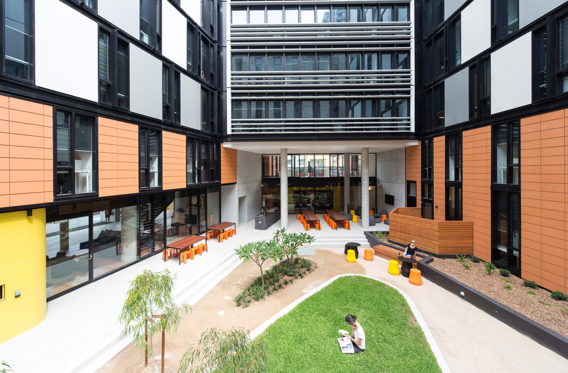 The 12 storey building is read as a series of stacked volumes that sit on a two storey terracotta base that provides warmth and a human scale to the street. The two lower levels of the building accommodate a range of indoor communal spaces that open onto a large landscaped courtyard for residents to meet and socialize.